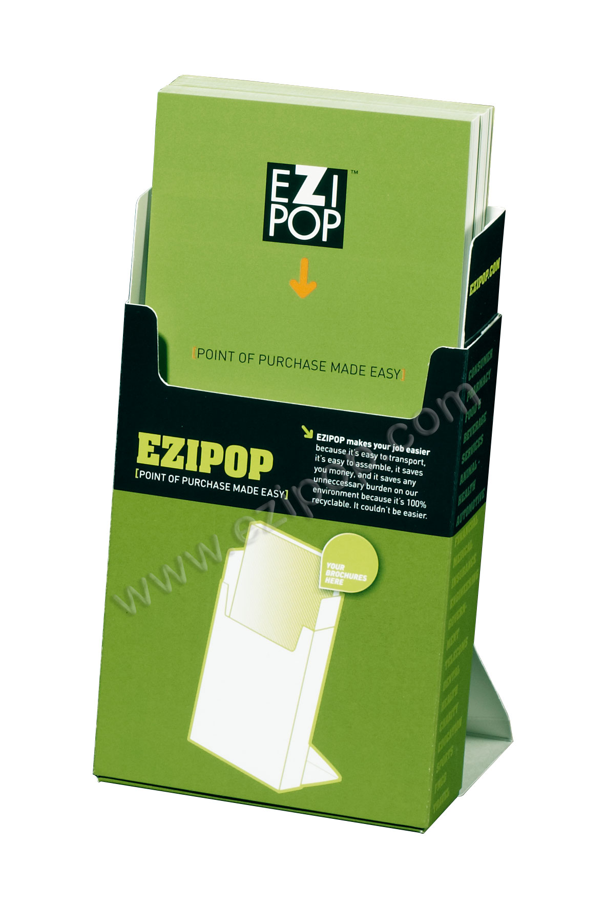 Because of their patented two sleeve sliding action with pop out rear strut, EZIPOPs can be shipped flat for quick and easy filling with brochures, then display when required, or we can pre-fill them for you, making them ready for popping up at Point Of Purchase (P.O.P). And the double wall construction means they are STRONG.